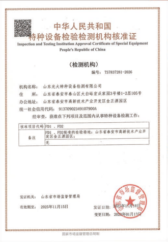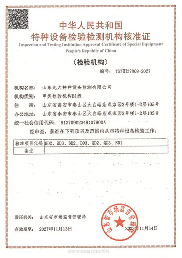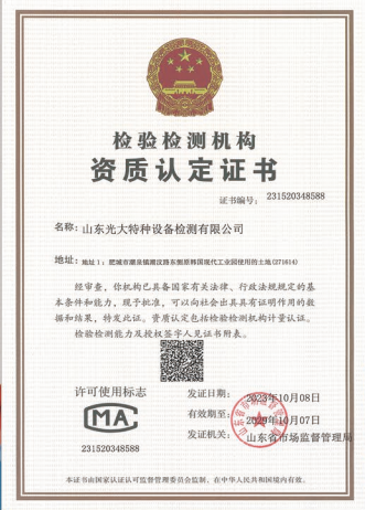山東光大特種設備檢測有限公司是經山東省市場監(jiān)督管理局核準的甲類B1特種設備綜合檢驗機構。2017年9月30日取得了山東省市場監(jiān)督管理局頒發(fā)的《檢驗檢測機構資質認定證書》。2018年2月22日取得了山東省市場監(jiān)督管理局頒發(fā)的《特種設備檢驗檢測機構核準證》(起重機械)檢驗檢測資質。2021年11月取得山東省市場監(jiān)督管理局版發(fā)的《特種設備檢驗檢測機構核準證》(安全閥在線、離線)校驗資質。2023年11月取得山東省市場監(jiān)督管理局頒發(fā)的甲類檢驗機構B1《特種設備檢驗檢測機構核準證》,具有壓力容器(RD2...
